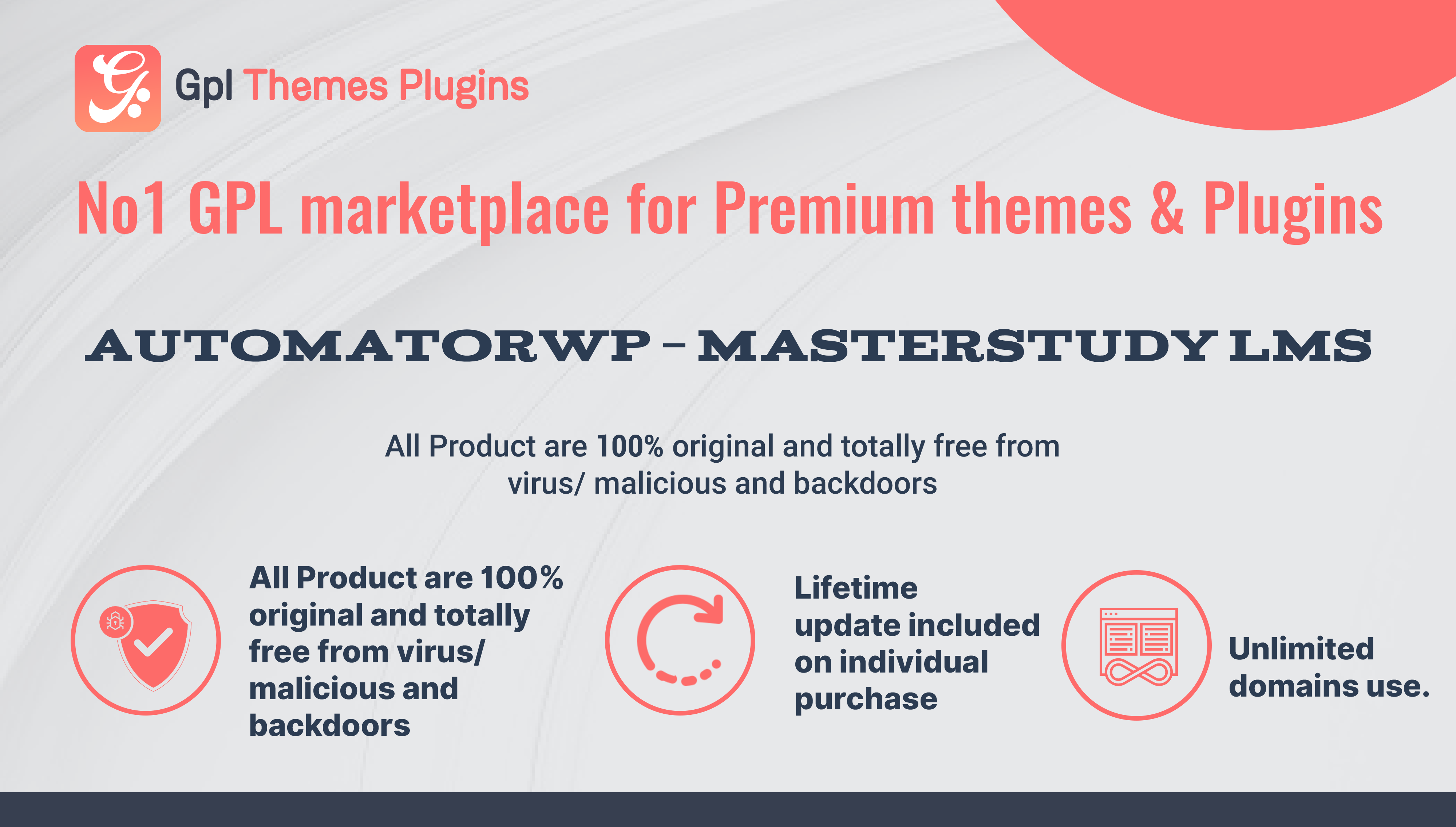 You can get AutomatorWP – MasterStudy LMS here on a huge discount on individual purchase, If you buy Gplthemesplugins membership then You can free download AutomatorWP – MasterStudy LMS as well as You will get access to all the products (31710) free like WordPress, Woocommerce, Joomla, Drupal, Magento, Muse, Opencart, Prestashop, Shopify, Unbounce, Ghost, Tumblr, Virtuemart, Graphics, Html templates, Php script and more … free! We provide an automatic upgrade service for the wp plugin, We provide 24/7 hour support by Email, Live chat, Whatsapp, Skype, as well as Phone Call support.